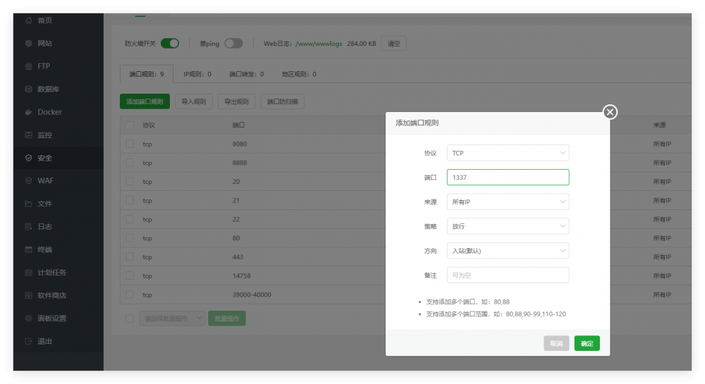 然后點擊寶塔面板左側菜單的安全-添加端口規則,放行8080和1337端口