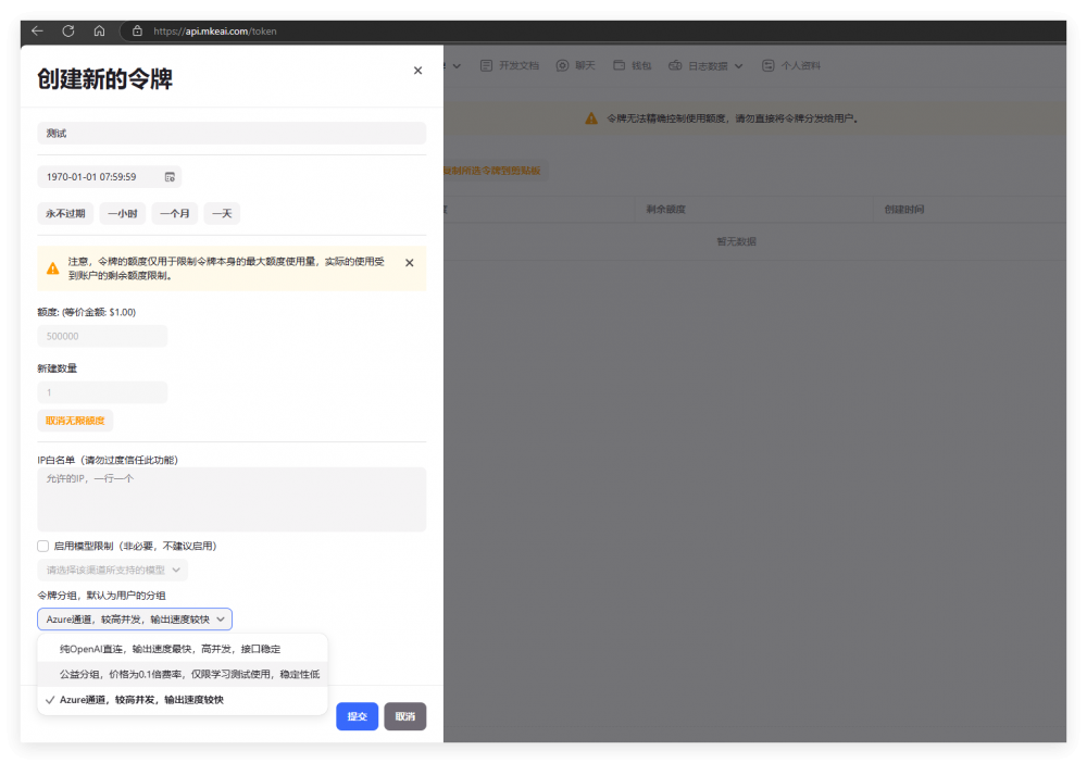 訪問https://api.mkeai.com 注冊賬號,然后點擊令牌-添加令牌。