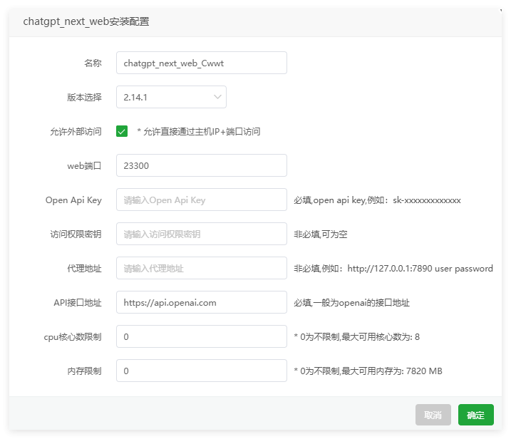 這里小編安裝的是ChatGPT-Next-Web,安裝時里面的參數保持默認就行了。