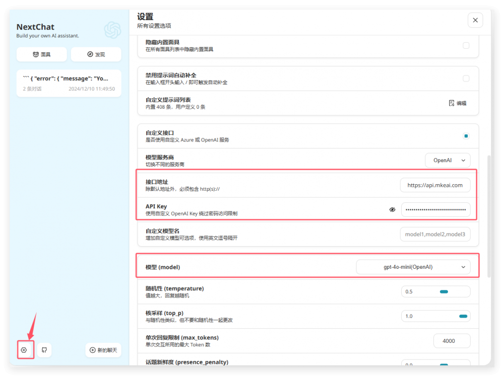 將令牌粘貼到API KEY中,并且將接口地址替換為https://api.mkeai.com