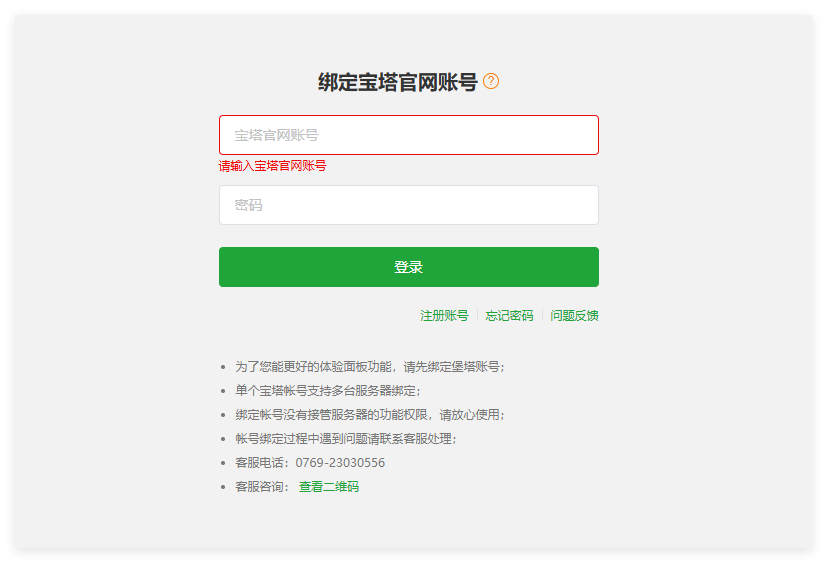 第一次登錄寶塔這里會要求綁定寶塔賬號,如果你沒有寶塔賬號的話,點擊登錄按鈕下面的注冊賬號,注冊完了在這里綁定一下。